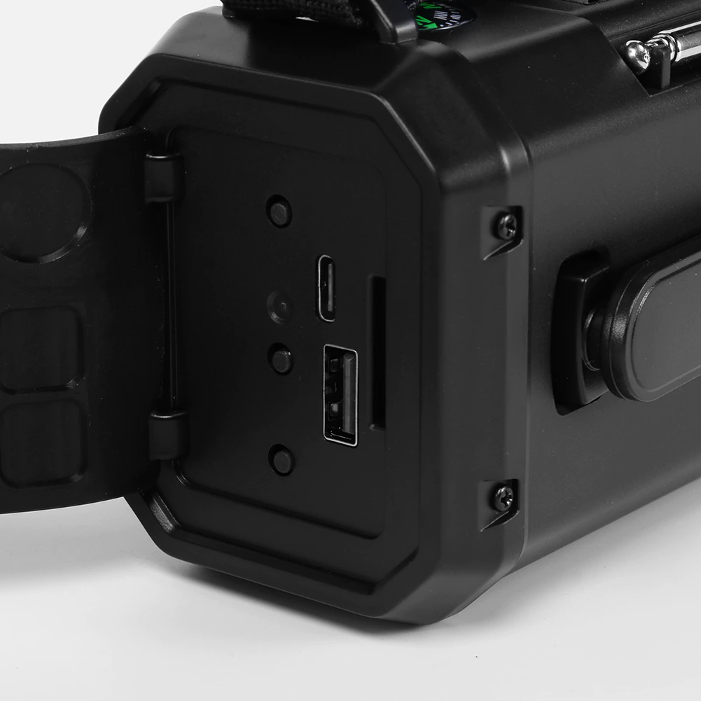 Denna robusta nödradion har en inbyggd powerbank och kan laddas via den inbyggda veven, solpanelen eller via USB-uttaget.